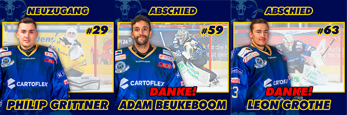Die Verpflichtung Grittners bedeutet im Umkehrschluss auch, dass der Adendorfer EC seine zwei ersten Abgänge der kommenden Saison auf der Torhüterposition verkündet. Sowohl Adam Beukeboom als auch Leon Grothe werden den Club verlassen und sich neuen Herausforderungen stellen. Dabei war insbesondere der Kanadier Beukeboom über die vergangenen drei Spielzeiten ein zentrales Puzzlestück im AEC-Kader. Für seinen Einsatz bedanken sich Kevin Matheja und Vadim Kulabuchov ausdrücklich: ‘Adam und Leon haben sich in ihrer Zeit bei uns in jede Trainingseinheit und in jeden Start voll reingehängt. Auf und neben dem Eis waren sie absolute Teamplayer. Wir wünschen beiden daher auf ihrem weiteren Weg viel Erfolg’, betont Geschäftsführer Matheja. Dem werden sich mit Sicherheit viele Fans des AEC anschließen.
